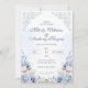 This elegant wedding design features soft dusty blue watercolor flowers, delicate French garden details, and romantic ornamental scrollwork. The layout feels refined and timeless, making it a beautiful choice for classic, formal, and romantic wedding celebrations. Pale blue florals with subtle blush accents create a graceful and airy look that works especially well for spring and summer weddings. The coordinated front and back design also pairs beautifully with wedding website and RSVP QR code details.