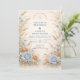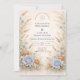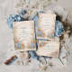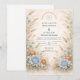 This romantic wedding design features soft blue and peach florals arranged in a delicate garden composition. Inspired by wildflowers and classic botanical illustrations, the artwork blends muted neutrals with airy florals for a timeless, refined look. The elegant layout and gentle color palette make it ideal for couples planning a nature-inspired wedding with a graceful, understated aesthetic that feels both modern and enduring.
