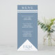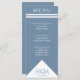 Dusty blue wedding reception menu card with white colour block geometric triangle and stripes. Elegant typography for an expensive look at an affordable price. Customise the meal list and personal details. Great for a modern minimalist wedding theme with a touch of style.