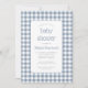 This baby shower invitation features a rustic dusty blue and white gingham checked background. The text appears in a white rectangle with a thin dusty blue border and rounded corners, with the words "baby shower" and the name of the mum-to-be in charming dusty blue typography and the remaining text in grey sans serif font. Ideal for a boy's or girl's baby shower. The gingham pattern is repeated on the back of the card.