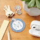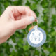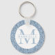 Beautiful muted light dusty blue glitter monogrammed keychain with a large initial and name or custom text over the top inside a circle.