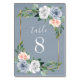 Dusty Blue Gold Blush Pink Peach Floral Wedding Table Number Cards - design features a watercolor dusty blue background with a gold frame trimmed in eucalyptus and greenery with floral elements in grey/white, dusty blue and blush pink/peach. View the collection on this page to find matching products.