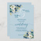 An elegant wedding invitation with dusty blue and gold glitter flowers and elegant calligraphy that you can customise with your details.
