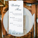 Elevate your reception with this elegant botanical wedding menu design, featuring soft dusty blue and muted green foliage accents for a refined, nature-inspired look. The flowing script header paired with clean, modern typography creates a timeless balance that feels both romantic and sophisticated.