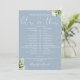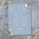 This stylish dusty blue greenery wedding schedule timeline can be personalised with your wedding details in chic typography. Designed by Thisisnotme©