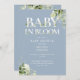 Baby in bloom baby shower invitation featuring elegant dusty blue typography and pretty botanical greenery foliage, and your QR code on the reverse. Designed by Thisisnotme©