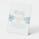 Elegant, simple, adorable floral dusty blue wedding personalised memorial table pedestal sign with beautiful wildflowers, gold rope heart and modern calligraphy script. In Loving Memory.