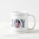 Dusty blue Joy with berries Christmas photo coffee mug. It showcases the word "JOY" in dusty blue with red berries and greenery while instead of the letter "O" there is your photo.