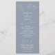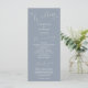 Minimal wedding program featuring modern script font on a dusty blue background. All the wedding ceremony information and the wedding party's name listed on this program.