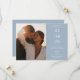 A modern minimalist save-the-date card featuring your special date, photo and wedding details set in classic, chic typography on a dusty blue background. Designed by Thisisnotme©