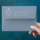 An elegant envelope with a monogram initial in a vintage crest on all sides. It is dusty blue outside and faux silver foil inside. The vintage crest is also faux silver foil. The return address is printed on the flap, with the monogram in crest on its left.