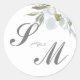 Seal your favour bags or botanical wedding invitation envelopes with these elegant stickers featuring your monogram in hand letter script typography worked into design on a solid white background with dusty blue florals and greenery. You can even use them as labels on lip balm tins for bridal shower favours. Designed to match my watercolor floral and greenery invitation collection. To see more wedding stationery visit www.zazzle.com/vginvites