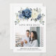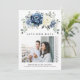 Dusty blue floral wedding QR code photo save the date card featuring elegant bouquet of navy blue, royal blue , white , gold, champagne ivory, blush colour rose , ranunculus flower buds and sage green eucalyptus leaves and elegant watercolor bouquet. Please contact me for any help in customisation or if you need any other product with this design.
