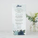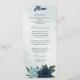 Unique wedding menu featuring romantic dusty blue and navy flowers and green leaves.