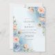 Soft watercolor washes in misty blue create an ethereal atmosphere for this romantic design. Delicate clusters of peach roses and sky blue blossoms are thoughtfully arranged with sage green foliage. The painterly style evokes a serene feeling, perfect for an elegant spring or summer wedding.