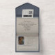 This unique wedding invitation design invites your guests to your travel wedding in style. The top page of the passport book contains your invitation, with a ticket appearing to peek out from behind it. Add your QR code to easily take guests to your wedding site. The bottom portion of the invitation tears off, giving your guests an rsvp postcard to return.