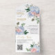 Modern wedding all in one invitation featuring light blue/ dusty blue watercolor hydrangeas with pastel pink , blush, peach , white roses, peonies, sage eucalyptus leaves, branches and foliage. Muted soft and dreamy romantic shades spring summer watercolor floral designs to match with your themed wedding.