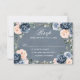 Dusty blue floral geometric wedding RSVP card featuring elegant bouquets of navy / Dusty blue, white , blush , peach rose and sage green eucalyptus leaves and elegant glitter geometric neutral frame. Please contact me for any help in customisation or if you need any other product with this design.