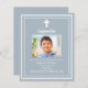 Dusty blue background, decorated with a white frame, and a white cross Personalise and add a photo name and details. White text.