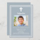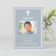 Dusty blue background, decorated with a white frame, and a white cross Personalise and add a photo name and details. White text.