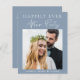 Budget-friendly dusty blue private wedding or elopement announcement and reception or celebration party invitation. The front features your photo and "Happily Ever After Party" in a mix of simple white typography and a chic modern white script. Underneath your photo, add your names and wedding date. On the back, personalise your message and reception details, input your wedding website address to create a QR code for your guests to scan for more information and to RSVP online, and add your names in a signature-like white script.