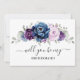 Elegant dusty blue Purple lilac lavender floral theme will you be my bridesmaid invitation featuring elegant bouquet of dusty blue, Navy, purple, lilac colour rose flowers buds and sage green eucalyptus leaves. Please contact me for any help in customisation or if you need any other product with this design.