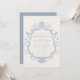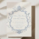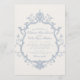 This is a dusty blue wedding inviation featuring a rococo style floral frame and classic serif fonts. Most wording can be edited to fit your plans, including names, date, and location. The design has a calm, romantic feel and works well with a variety of wedding styles.