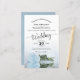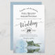 This beautiful wedding invitation features a romantic design with a single long stemmed pale dusty blue rose laying on its side and reflecting in a pool of water. The typography features lacy script calligraphy and a sophisticated layout. The back is a marbled light purple colour. Wonderful way to invite your friends and family to share in your joy on your special day.