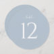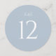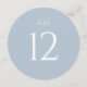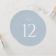 Elegant round wedding table number featuring a soft dusty blue background with clean white typography. The minimalist design with a large, easy-to-read number adds a refined and cohesive touch to your reception tables.