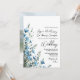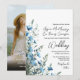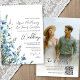 Rustic boho Chic vibes abound in this beautiful wildflower wedding invitation. The design boasts dusty blue blossoms and sage green grasses with elegant script lettering. The right justified text flows seamlessly with the flowers on the left creating a feel that is at once modern and timeless. The back features your photo along with a customisable QR code to direct your guests to your wedding website for details and RSVP. Stylish and elegant, yet casual and down to earth, this invite is the perfect way to ask your friends and family to share in your joy on your special day.