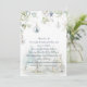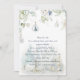 Modern Christmas party invitation featuring winter flowers in white, cream, dusty blue, and sage green with snowflakes and snow globe ornaments. The text is a handwritten calligraphy font in dusty blue. The back of the card is dusty blue with snowflakes. Personalise with your own information.
