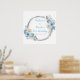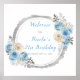 Beautiful birthday party poster with a dusty blue and silver faux glitter frame with floral flower arrangements. Perfect for a birthday party. The words can be changed to suit your own details or requirements