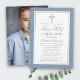 Modern Elegant Dusty Blue and Silver First Holy Communion Invitation with Cross. Photo Back.