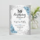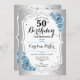 Elegant floral feminine 50th birthday invitation with your photo at the back of the card. Glam design with faux silver. Features dusty blue roses, script font and confetti. Perfect for a stylish adult bday celebration party. Personalise with your own details. Can be customised for any age! Printed Zazzle invitations or instant download digital printable template.