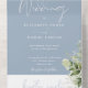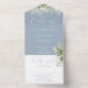 All in one dusty blue wedding invitation featuring pretty string lights, floral greenery and elegant typography. The invitation includes a perforated RSVP card that can be individually addressed or left blank for you to handwrite your guest's address details. Designed by Thisisnotme©