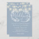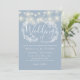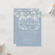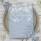 A dusty blue wedding invitation featuring pretty string lights and a delicate hand-drawn rustic floral garland of botanical leaf foliage with stylish script typography. Personalise with your special wedding day information. Designed by Thisisnotme©