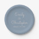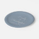 Dusty Blue and white custom wedding or reception dinner paper plates. The text of the dusty blue simple and elegant plates can be updated and customised with your name and wedding date.