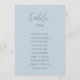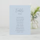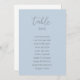Modern, minimalist seating chart card by table features a dusty blue background. Personalise with your guest's names and table numbers with the easy to edit template featuring a romantic script font and modern sans serif font.