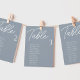 Modern Dusty Blue Wedding Table Seating Chart Cards are the perfect finishing touch for your wedding reception. Guide your guests to their seats with this unique seating chart. The cards are perfect for hanging or displaying on a board or wall. The design features a minimal script font with elegant san serif in white on a blue background. The design is printed on both sides.