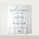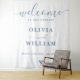 dusty blue welcome backdrop, elegant blue wedding banner, serene reception photo booth, blue wedding decor, custom dusty blue sign, classic wedding backdrop, soft blue event banner, spring wedding welcome, large welcome sign, blue wedding entrance