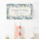 Elegant dusty blue and white roses women's "Happy Birthday" party banner. Text, "Happy Birthday" is written in a beautiful handwritten script font. Personalised with the name of the guest of honour. Contact me for assistance with your customisations or to request additional matching or coordinating Zazzle products for your party.