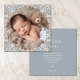 Featuring a beautiful watercolor floral wreath that encircles your baby's photo, this card is set against a trendy, soft dusty blue background.