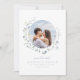 Elegant delicate watercolor wildflower wreath frames couple's picture, with custom your own event details in dusty blue. Pastel palettes of soft yellow, off white, sage green, dusty blue, and botanical greenery, Great photo save the date cards for modern rustic wedding, country garden wedding, and boho wedding in spring and summer.