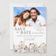 This Dusty Blue Wildflowers Elegant Two Photo Wedding Save the Date Invitation showcases two of the couple's photos, with watercolor wildflowers in dusty blue, purple and yellow on a white background, complemented by contemporary typography and script calligraphy. It is fully customisable with the couple's names, wedding details and the photos of your choice. The formal design and wording will add a touch of elegance to your wedding celebration. The back photo has a white gradient at the bottom, so the couple's names will show up over any photo.