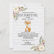 A baby shower invitation featuring an illustration of a baby fox wearing a flower crown. Custom poem. Personalise the text. Background is light grey wood inspired design.