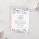 Elegant watercolor garden flowers and foliage in dusty shades of pink, violet, crème, blue and green, wedding invitation. Back of card features solid blush pink colour.