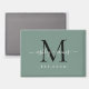 Dusty Green Modern Script Monogram Names Year magnet featuring a bold black initial layered with white script names and a personalised established year. The soft green background and clean typography create a calm, modern look that works beautifully as a newlywed keepsake, anniversary reminder, or thoughtful personalised gift. Ideal for displaying on refrigerators, office boards, or memory spaces to celebrate a shared name and year. Easily personalise with your details.