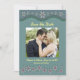 Dusty Green Six Petal Flower Save the Date Flat Card. The Front has valance with a lace image. Convert this for any occasion. Personalise this template with your text and photo.