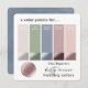 This is Chic Paperie's Wedding Colour Palette Card in the Dusty Mauve & Blue Colorway of: Gardenia Off-White, Light Leaf Green, Blue Mist, Dusty Rose Mauve, & Powder Blush Pink. A beautiful colour combination for a Spring or Summer Garden or Outdoor wedding! Shown with flat and metallic colour swatches. Colour swatches have the handy hex colour codes.