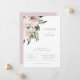 Chic and simple typography design, wedding invitation that features watercolor floral bouquets in shades of mauve with flowing foliage. Back of card features template space for additional details.